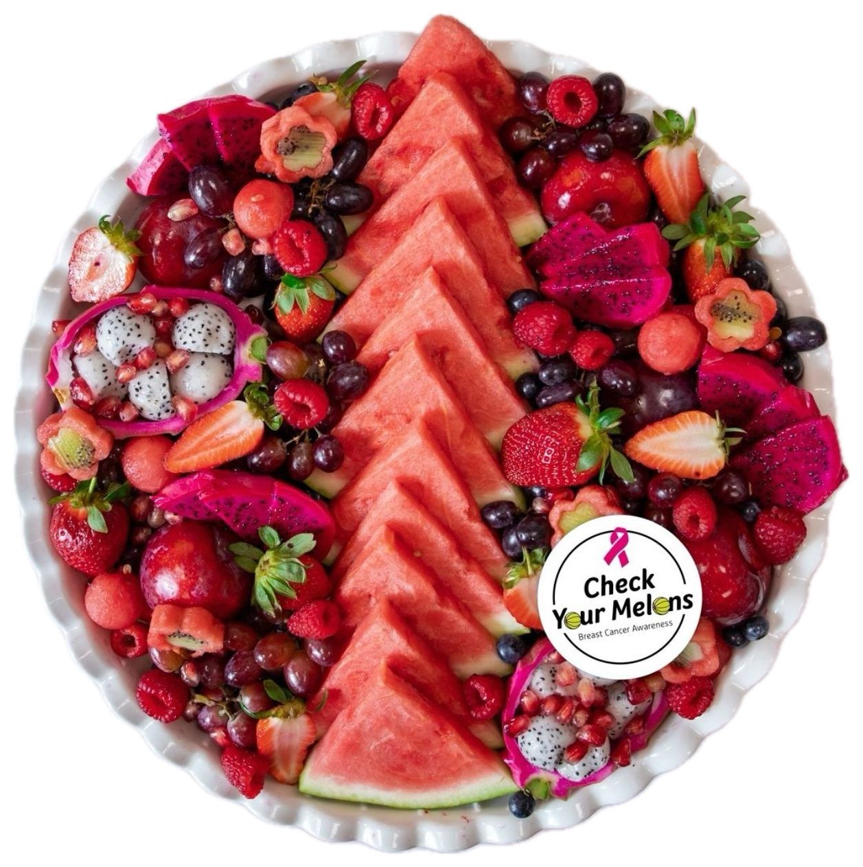 Enjoy a palette of rosy hues with succulent strawberries, juicy watermelon, ripe raspberries, and more. Each bite not only brings joy but also helps spread hope and awareness in the fight against breast cancer.