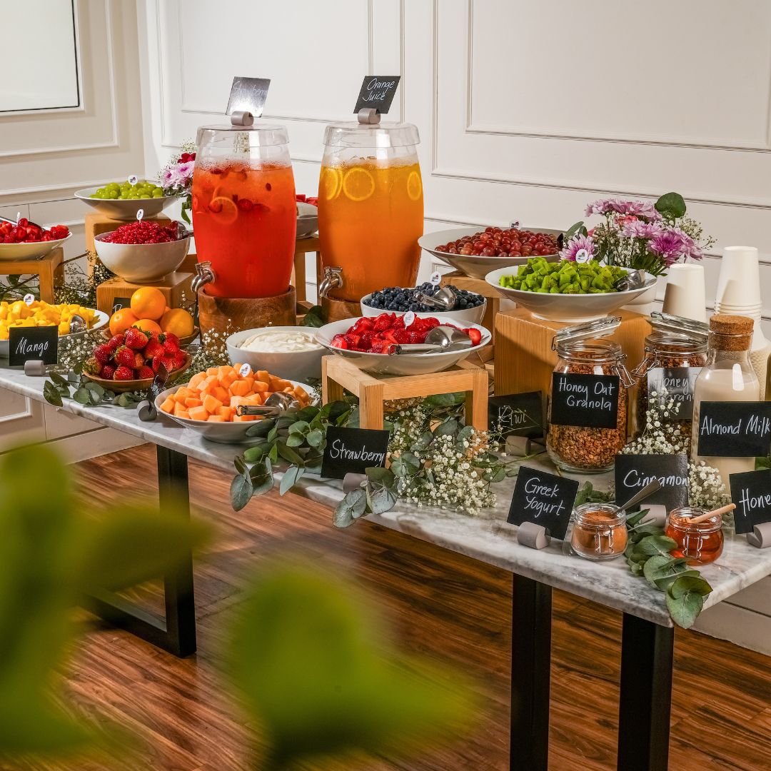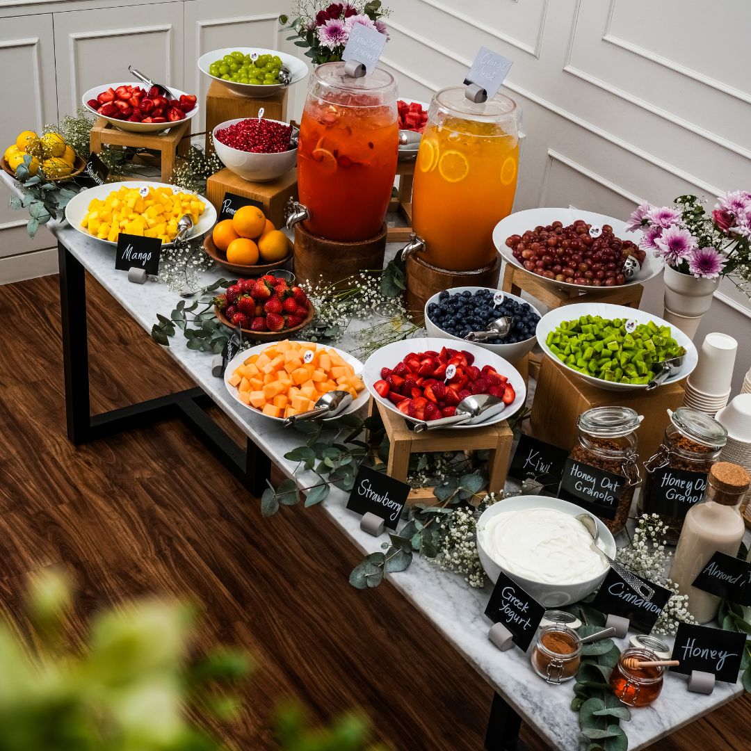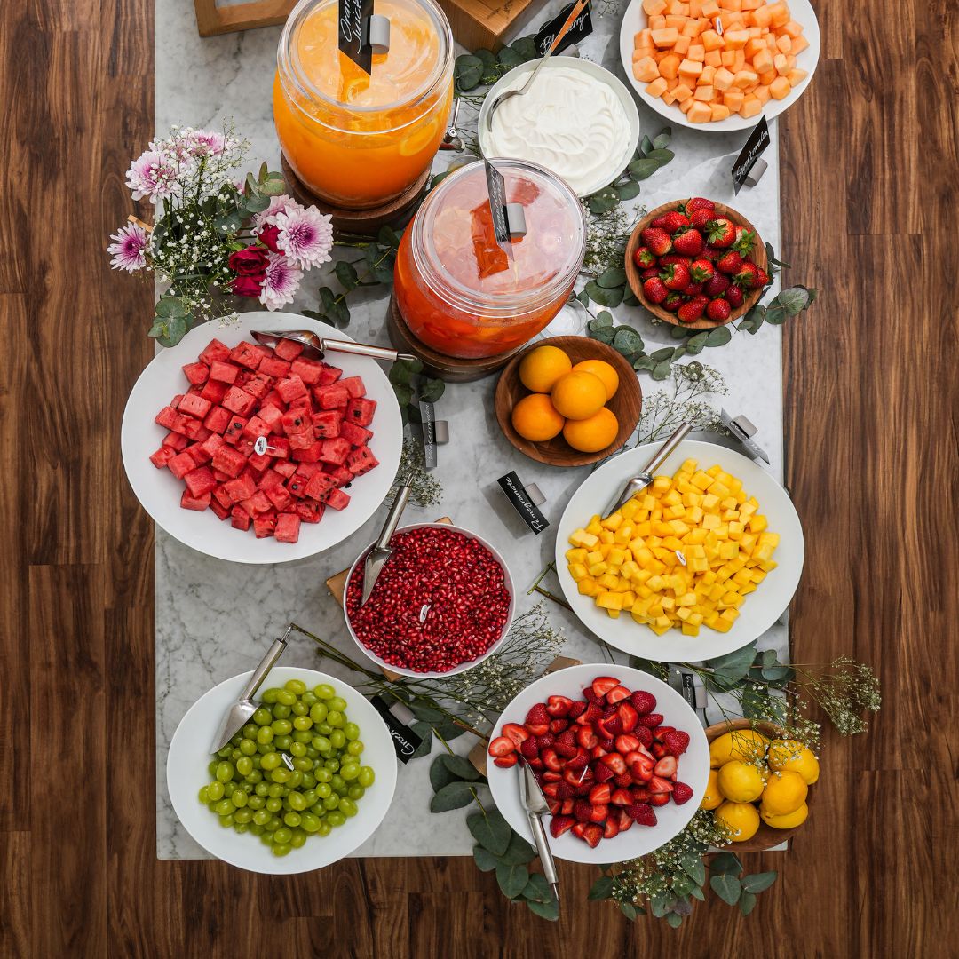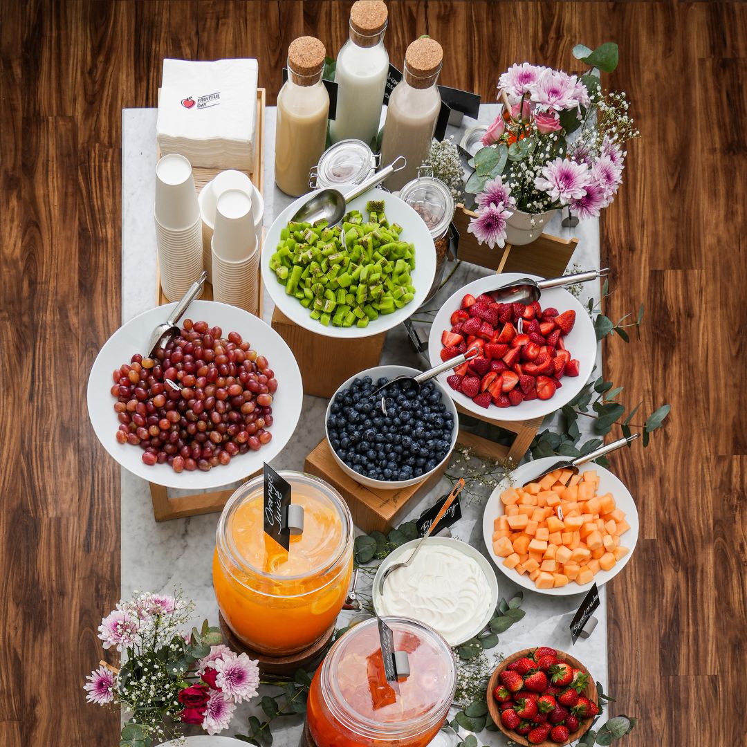 Our Healthy Breakfast Buffet includes 5 kilos of plain greek yogurt, 5 liters of milk (dairy or non-dairy), 3 kilos granola, honey & cinnamon and your 10 kilos choice of fruits.